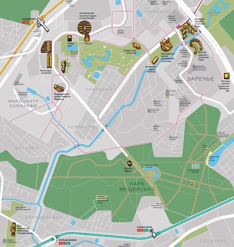 Набережная реки Сетунь, Парк Мещерский, Активити-центр theRink, МШУ Сколково, Гольф-клуб Сколково, Деловой квартал Сколково Парк, Гимназия Сколково, Ветеринарный госпиталь Сколково Вет, Медицинский центр Hadassahи многое другое.